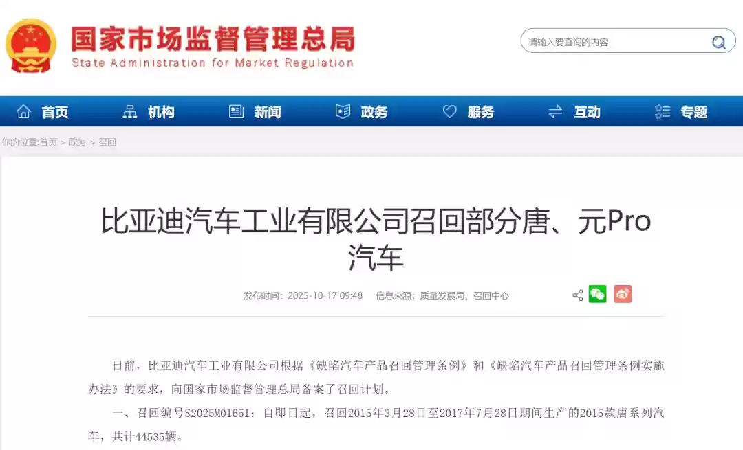 国家市场监督管理总局近日发布公告,比亚迪汽车工业有限公司依据《缺陷汽车产品召回管理条例》及其实施办法,已向监管部门提交召回计划备案,涉及旗下两个车型的批量召回。