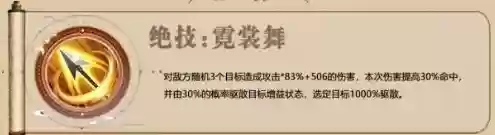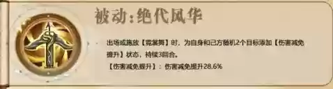 在出场或释放【霓裳舞】时,为己方和随机2个目标添加【伤害减免提升】状态,持续3回合。【伤害减免提升】:使受到的伤害降低28.6%。