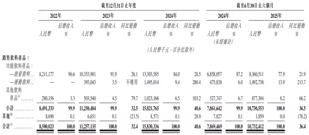 2023年和2024年,运动饮料业务收入分别为3.93亿元和14.95亿元,同比增长速度高达280.4%,占营收的比例也由3.5%快速提升至9.4%。2025年上半年,运动饮料业务依旧保持高速增长态势,同比增长66.2%至8.77亿元,占营收的比例进一步提升至8.2%。