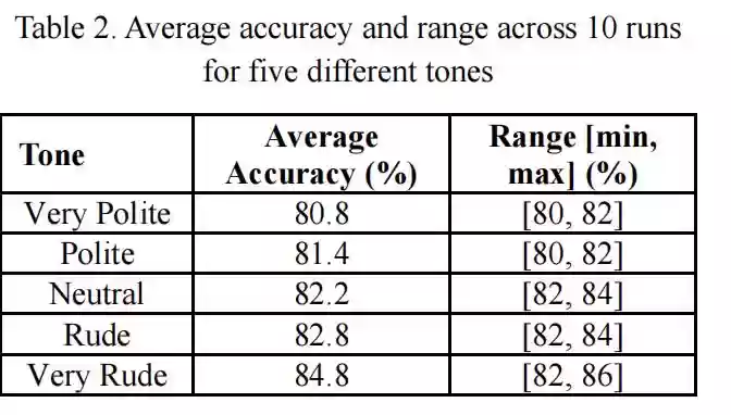 研究者进行了10轮独立实验,并使用配对样本t检验分析语气差异的显著性。结果显示,在八组语气对比中,语气确实显著影响准确率(p≤0.05)。从“非常礼貌”到“非常粗鲁”,正确率持续上升,没有出现逆转。