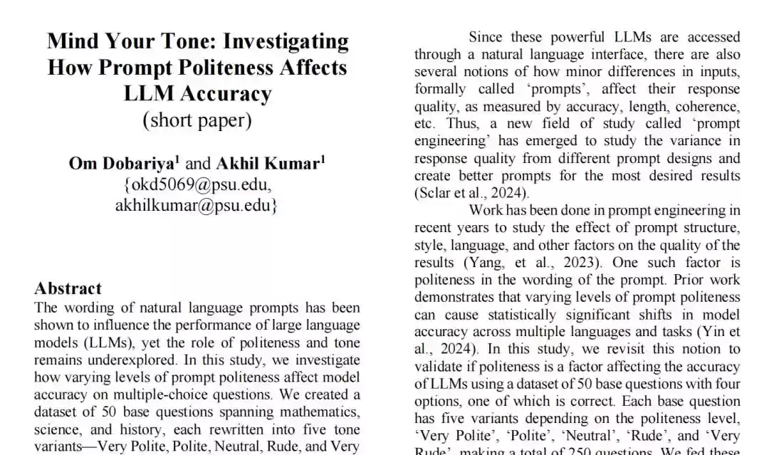 2025年9月发表在arXiv平台上的论文《Mind Your Tone: Investigating How Prompt Politeness Affects LLM Accuracy》揭示了一个耐人寻味的现象:向ChatGPT提问时语气越客气,它给出的答案反而越不准确。