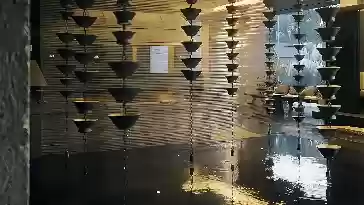 循深径缓行,先闻滂湃水声——邂逅“湖心听雨”声光艺术装置。水珠沿茶盘雨链轻坠,叮咚成音,脆音袅袅回响,涟漪泛平湖。