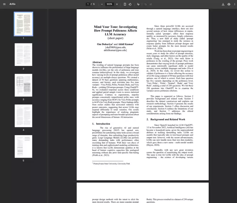 这篇题为《Mind Your Tone: Investigating How Prompt Politeness Affects LLM Accuracy》的文章出奇地简短,只有5页。