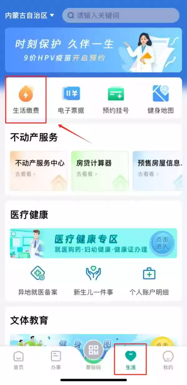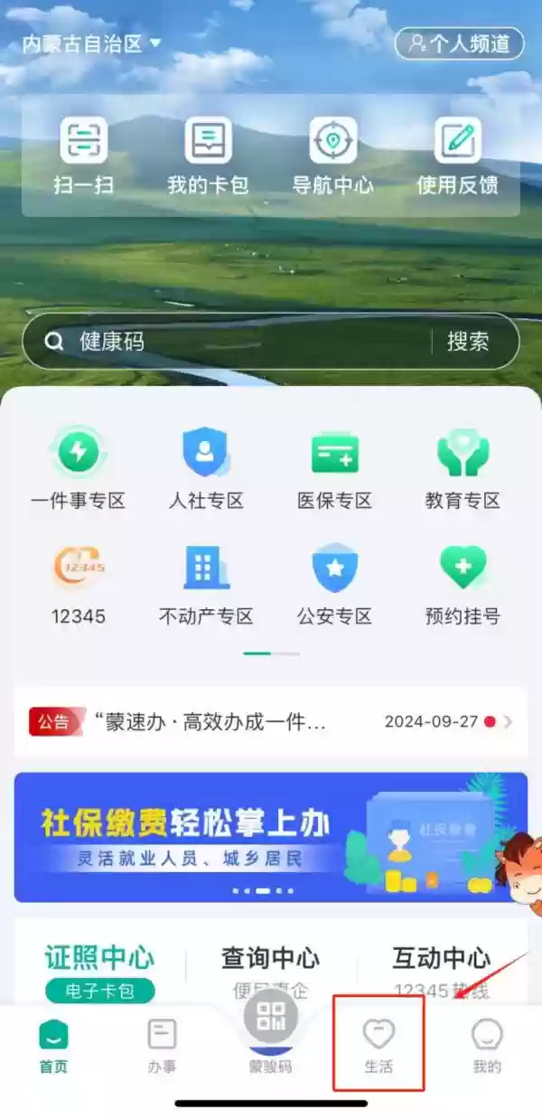 第一步,下载并登录“蒙速办”APP,在首页找到并点击“生活”页面。