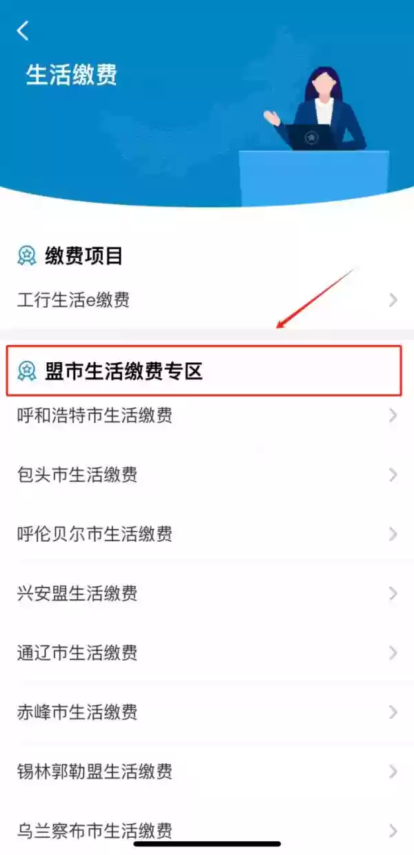 第三步,进入“生活缴费”页面后,在“盟市生活缴费专区”下选择所在盟市的生活缴费服务,点击进入。