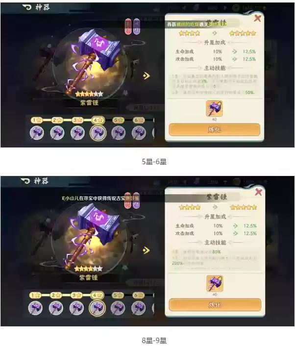 3、神器紫雷锤堪称开荒利器,连boss都会被砸得晕头转向。性价比最高的为5星(下一个提升pve伤害的星级高达9星)