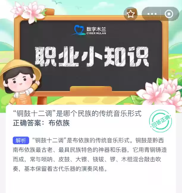 "铜鼓十二调"是哪个民族的传统音乐形式?【蚂蚁新村每日一题】2025年10月17日题目已发布!坚持答题,积累木兰币,即可加速小镇建设。答对本题,立即可享"产速+3/时"的加速奖励!今天正确答案是【布依族】。"铜鼓十二调"是布依族的传统音乐形式。它用青铜铸造而成,常与唢呐、皮鼓、大锣、铙钹、镲、木棍混合敲击吹奏,基本保留着古代乐器的演奏风格。