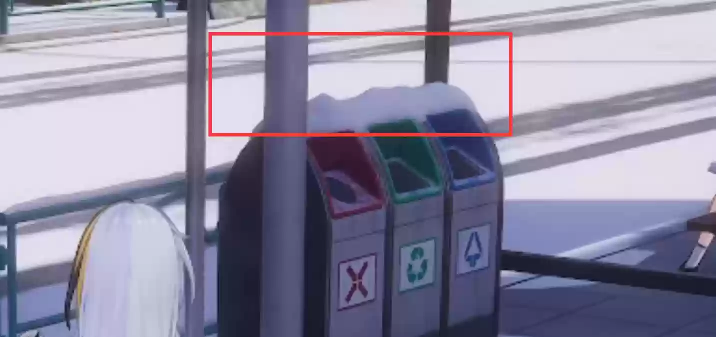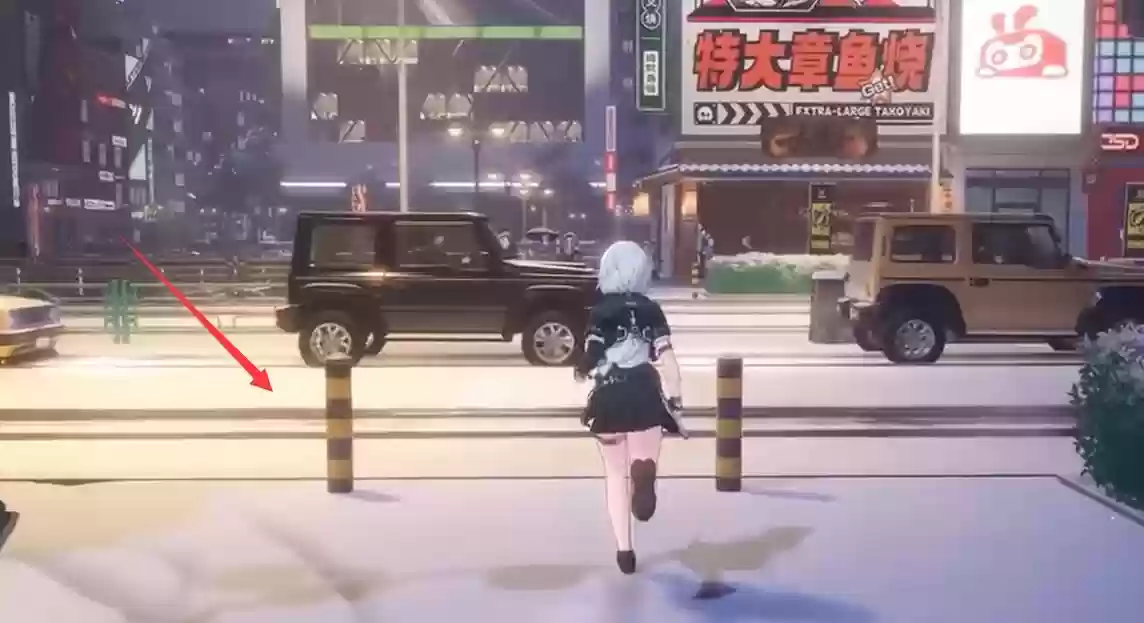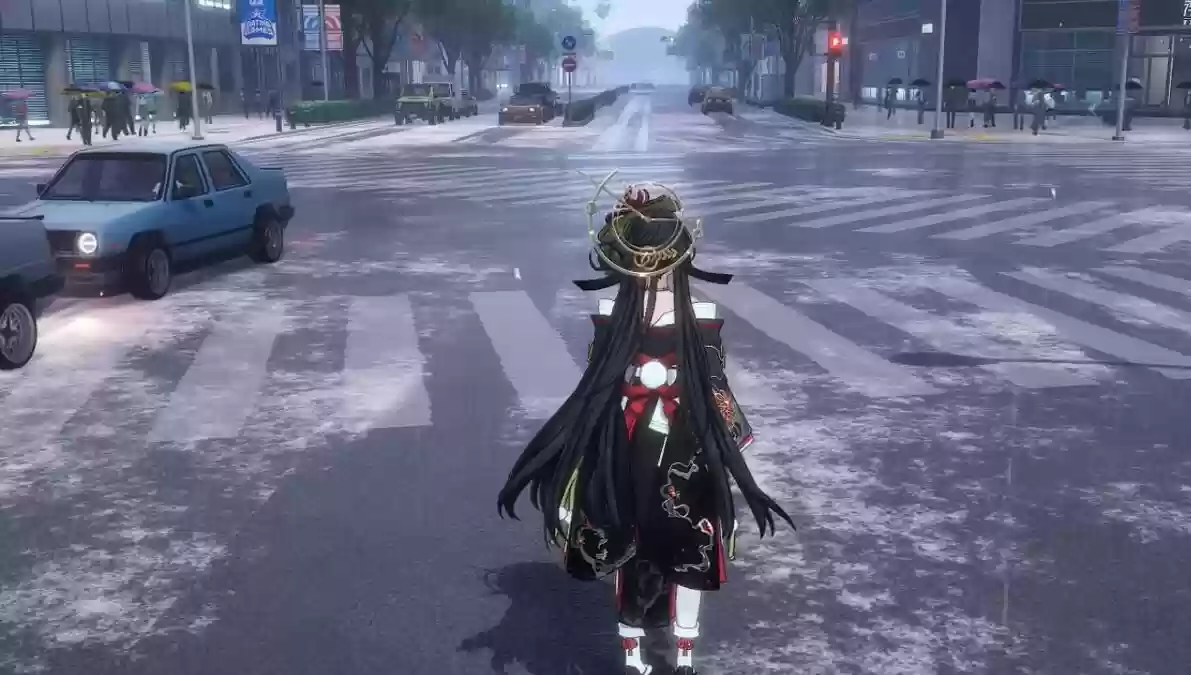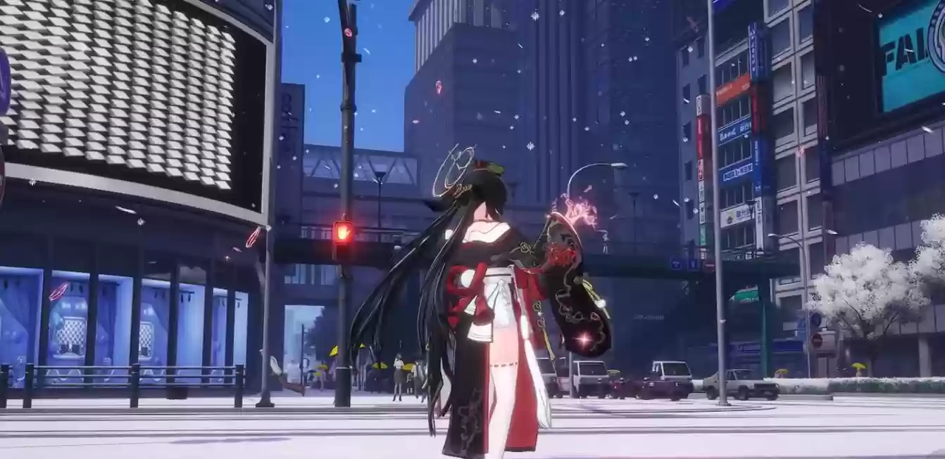 除了天气系统,与之配合的时停机制也颇具匠心。普通游戏暂停时画面会完全静止,但在《异环》中,雪花会瞬间变成晶莹剔透的静态颗粒,而且全部朝着你的方向定格,颇有《黑客帝国》子弹时间的立体电影质感。室内外积雪的区分也做得相当细致:进商店前脚下还是白茫茫一片,推门的瞬间积雪消失,出来后又立即开始重新积攒。目前虽然存在一些小问题(比如屋檐下积雪偶尔会突然暂停,走两步又继续飘落),但整体并不影响游玩体验。