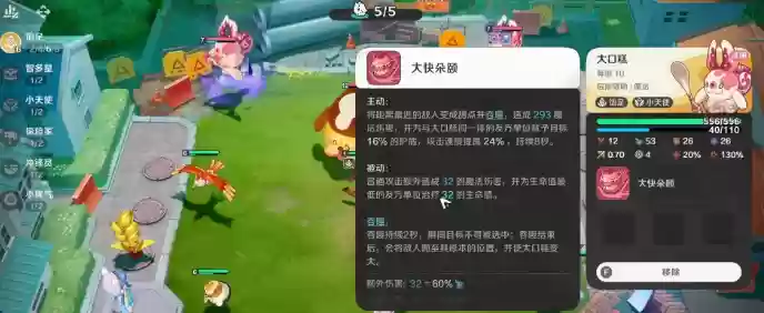 大口糕定位为后排魔法辅助型精灵,其核心机制围绕“饱足”展开,拥有“小天使”特性,主动技能“大快朵颚”充满视觉冲击力。该技能分为主动释放和被动增益两种效果。发动主动技能时,大口糕会锁定距离最近的敌方单位,将其转化为点心并瞬间吞噬,造成可观的魔法伤害。与此同时,与大口糕处于同一排的友方单位将获得一个吸收伤害的护盾,并在8秒内获得攻速加成。具体数值方面,护盾量相当于目标最大生命值的16%,而攻速提升幅度高达24%。