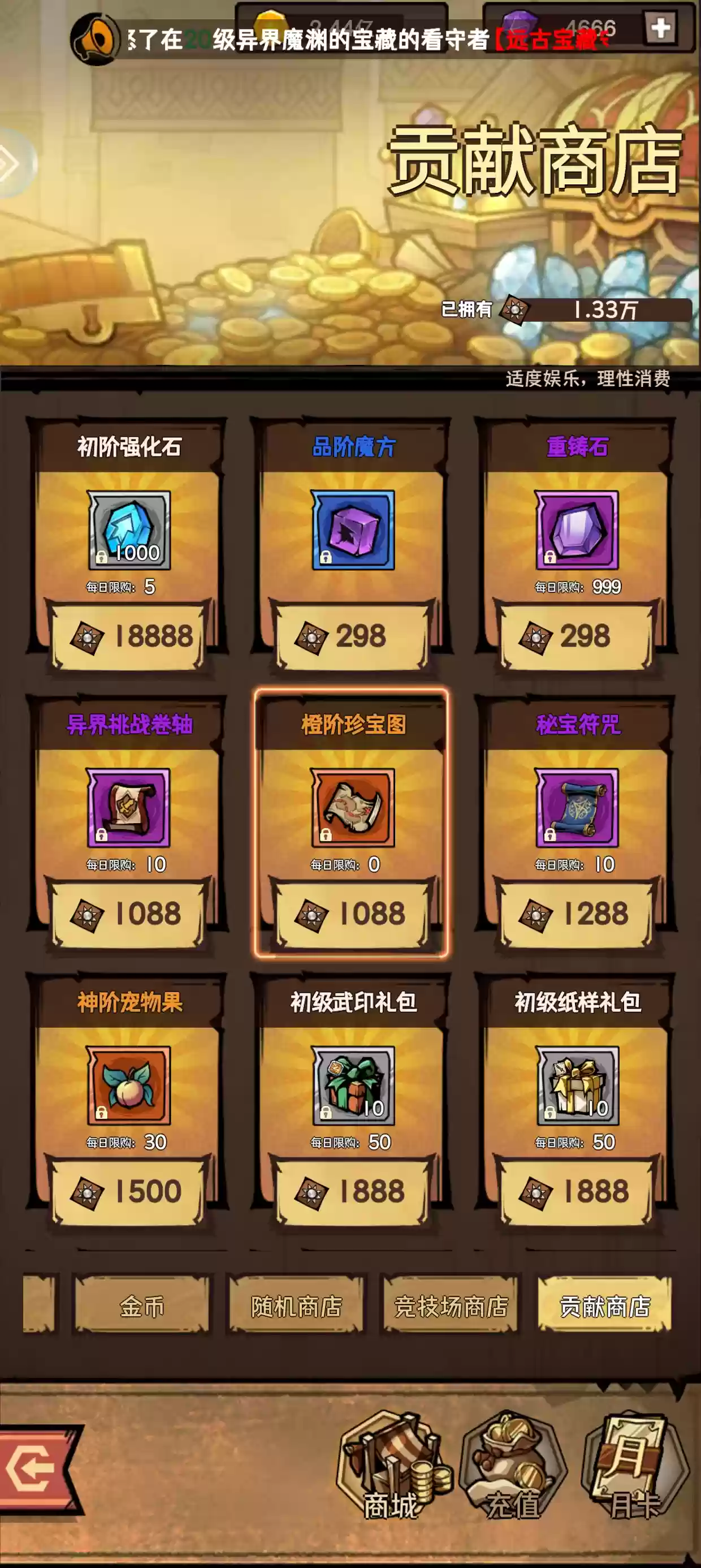 金币商店每日刷新的宠物果、强化石、普通寒铁、异界挑战券都建议买满。
