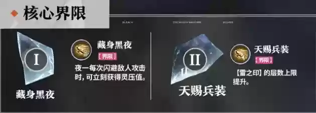 而这些刻印给她搭配的时候带来的输出能力才是最大化的。后期大家想要给刻印带来更多的搭配,那么在核心界限上面大家可以选择的是藏身黑夜,这是夜一比较重要的一个技能,每一次使用的时候还可以闪避掉敌人的攻击,那么在成功闪避之后自身还可以获取更多的灵压值。此时搭配天馈冰装雷之印的话,可以带来一定的层数积累,层数上限还是比较高的。她有这样的技能,后期提升雷之印的效果,还可以减少其他的闪避冷却时间,所以相对来说有了这样的刻印及极限加成,她的整体闪避也会有更多的触发几率。