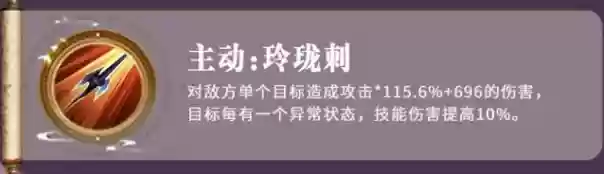 她的另一个主动技能“玲珑刺”是一个单体目标技能,使用时会对一名敌人造成攻击,这里的输出数值达到了攻击力的115%,再加上固定的696点伤害。此时他会根据敌人身上的状态带来一个叠加伤害,如果选择的这个目标身上有一个异常状态的话,技能伤害就可以提升10%,而且这个效果还是可以叠加的,当然最后叠加的数值也不能超过张春华攻击力的两倍。