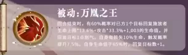 张春华的第三个技能是一个被动技能,叫做“万焰之王”,使用这个技能的时候,一般是在回合结束的时候可以触发,其中有60%的概率会对其中的一个敌人进行释放输出,这里的输出是根据他生命上限的13%,加上攻击的33%,再加上固定的1003的生命值进行输出,并且此时她还会给队友恢复一点怒气数值。自身每损失10%生命的时候,他的触发概率就会有所提升,一次提升就达到了7.5%。而在她生命数值低于65%的情况下,他这里的恢复目标数值会增加1个,也就是说此时会给两个队友都带来足够的恢复量。