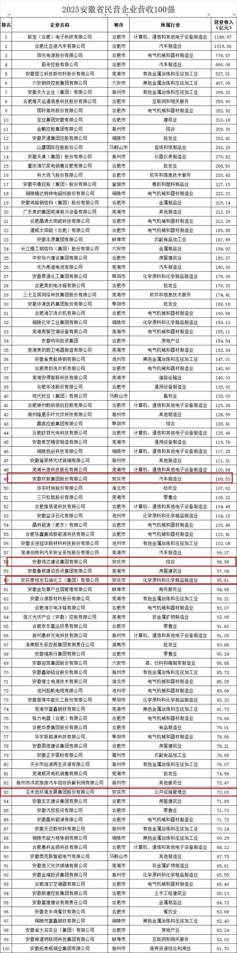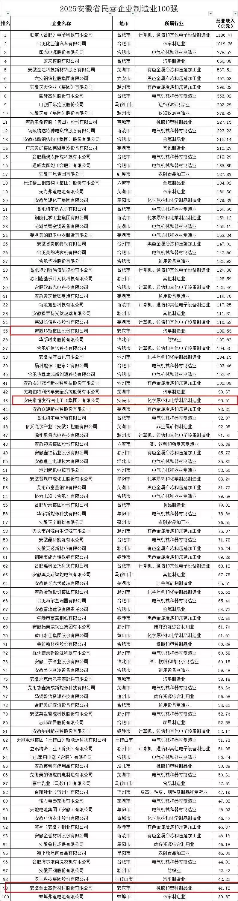 2025安徽民企百强揭晓:联宝比亚迪荣登营收与制造业前五