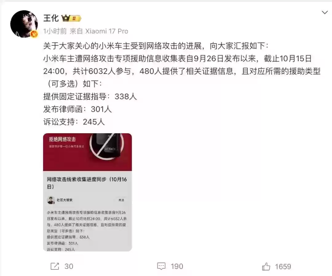 近期,小米公司为遭遇网络攻击的车主启动的专项援助行动取得了新进展。小米公关部门披露,自9月26日开通专项信息收集渠道至10月15日24时,已有6032名用户参与反馈,其中480人提交了相关证明材料。