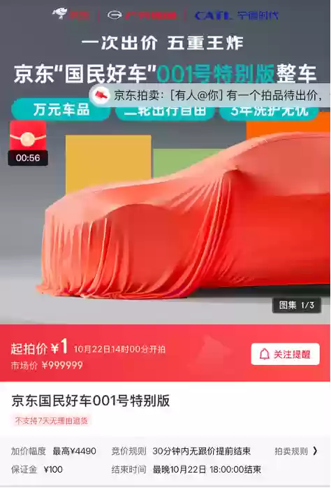目前一款名为京东"国民好车"001号特别版的整车已登陆京东拍卖频道,将于10月22日14时00分开启竞拍,起拍价1元(当前标注市场价为999999元)。