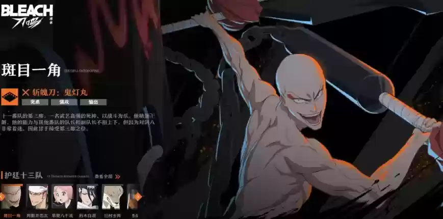 第四位推荐是斑目一角,这位近战型强攻角色在输出方面极具优势。其被动效果能随着敌方减员不断提升我方输出,形成"敌弱我强"的良性循环。必杀技可对范围内的敌人造成群体伤害,只要身处攻击区域内的目标都会受到波及。进入卍解状态后,所有攻击都会得到强化,他能根据自身状态获得相应的能力提升。