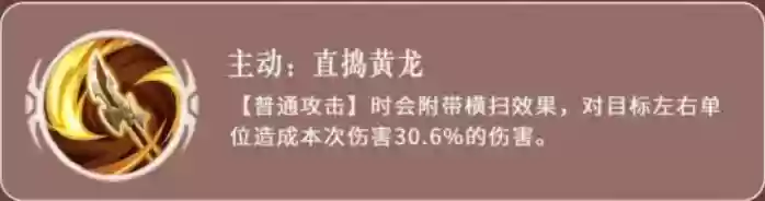 他的主动技能“直捣黄龙”在使用时会附带横扫效果,这个效果是在普攻时额外触发的,可对一个敌人周边的左右两个角色造成本次伤害的30%附加伤害。虽然附加伤害的百分比不高,但毕竟是普攻之外的追加伤害,完全可以当作连招后的小范围补充技能使用。