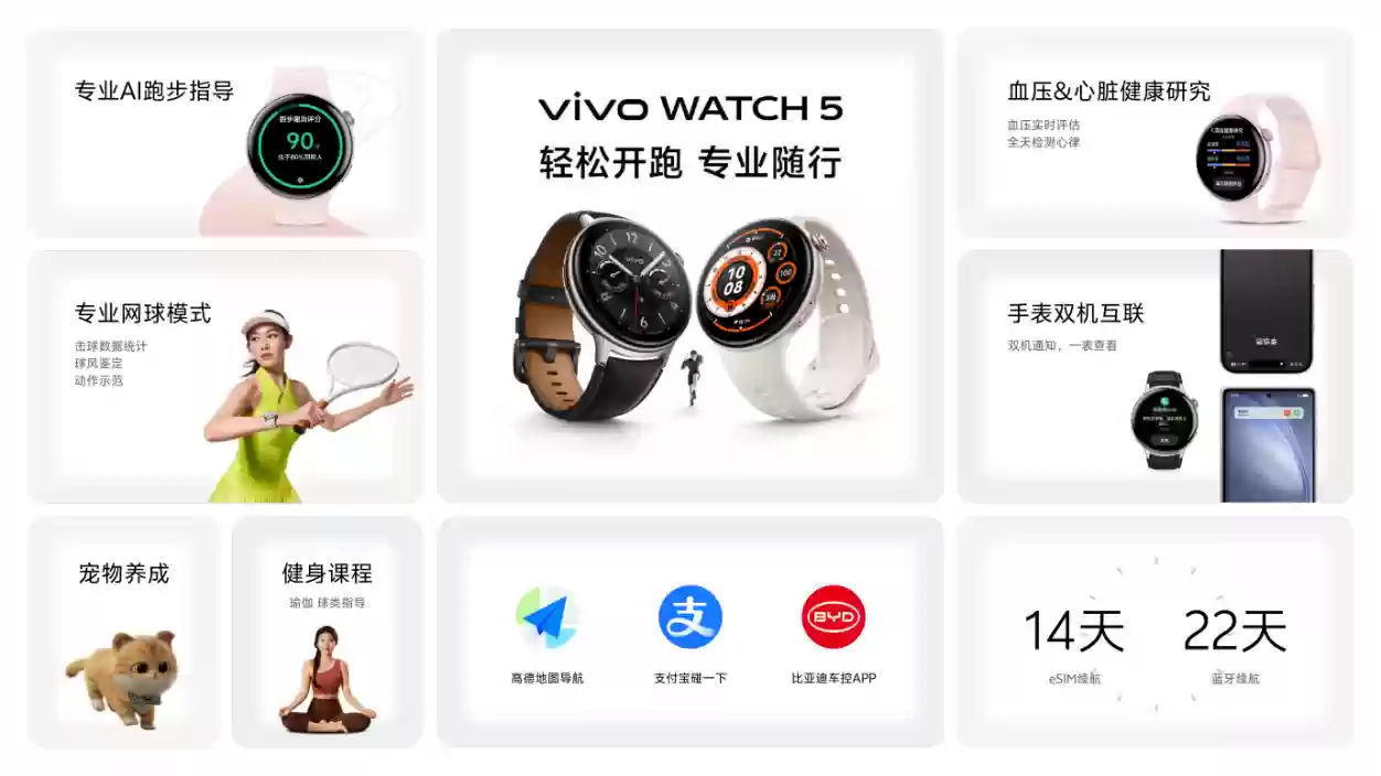 vivo WATCH 5联手浙江大学运动科学实验室,创新推出"跑步能效"科学评估体系,通过量化指标直观呈现跑步水平;专为燃脂跑用户设计的AI个性化训练计划,可实时指导呼吸节奏与配速;全新升级的网球专业模式,可在手表端直观呈现握拍姿势及挥拍动作数据,帮助用户科学提升运动表现。