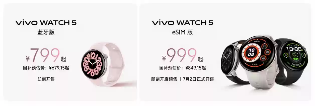vivo WATCH 5"星纱粉"配色售价799元,补贴后仅需679.15元,即刻开售;eSIM版售价999元起,补贴后849.15元起,现正预售,预计7月2日正式开售。