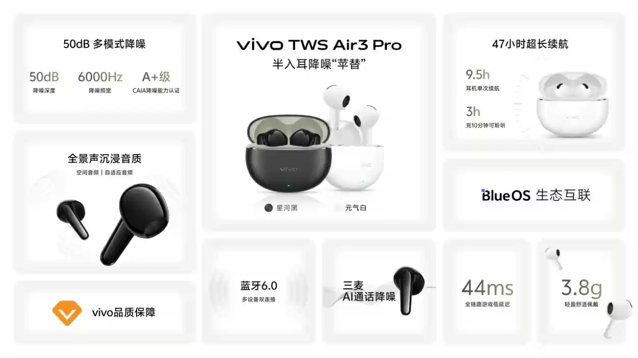 vivo TWS Air3 Pro发布:半入耳降噪苹果替代,沉浸听感升级