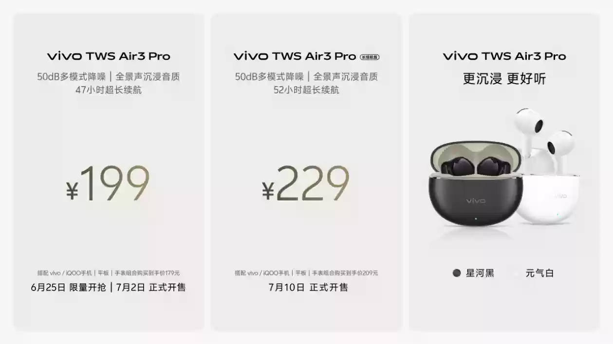 vivo TWS Air3 Pro提供"星河黑"与"元气白"两款配色,标准版售价199元,6月25日发布会后开启限量抢购,7月2日正式开售;长续航版售价229元,现正接受预订,7月10日正式开售。7月31日前,购买vivo TWS Air3 Pro标准版或长续航版,搭配vivo/iQOO手机、平板、手表产品组合购买,均立减20元。