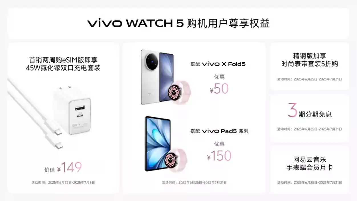 7月8日前购买vivo WATCH 5 eSIM版,即赠价值149元的45W氮化镓双口充电套装。7月31日前,购买vivo WATCH 5可享3期免息,搭配vivo X Fold5组合购买立减50元,搭配vivo Pad5系列组合购买立减150元,另赠网易云音乐手表端会员月卡。喜爱这款精致"腕上AI助手"的朋友们千万不要错过。