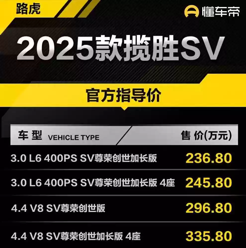 2025款路虎揽胜SV上市236.8万起,3.0T/4.4T动力配定制服务