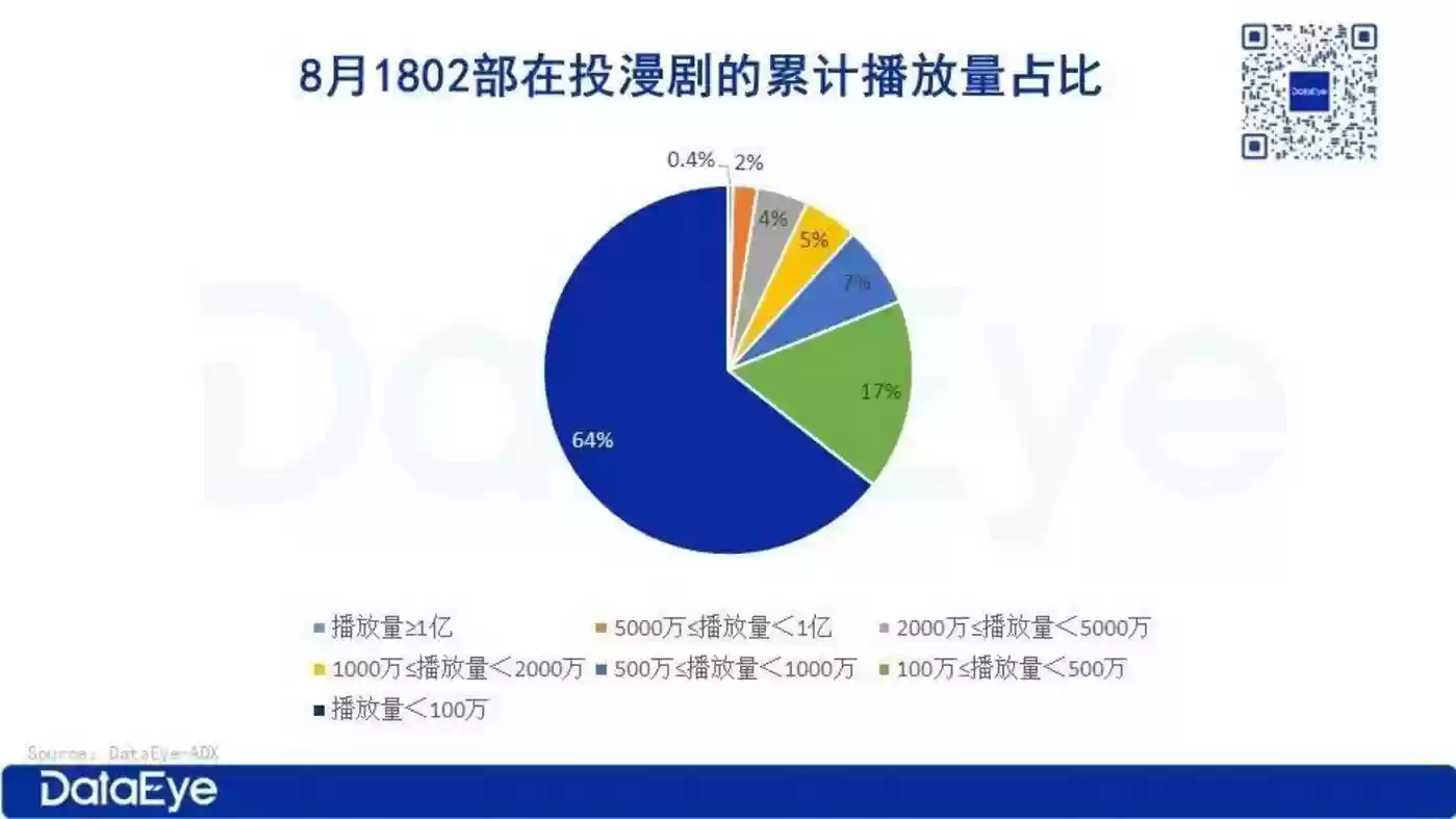 再进一步来看,8月1802部在投漫画的累计播放量中,播放量达1亿的仅有8部,占比0.4%;46部超过5000万次(占比2.6%);213部超1000万次(占比12%)。剩下64%的漫画累计播放量不足100万。