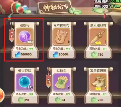 缺少进阶丹怎么办?新手前期通过白嫖获得的仙玉不要乱用,全部拿到神秘坊市购买进阶丹,有多少买多少。神秘坊市每天会刷新多次,看到打折的进阶丹直接入手即可。其他非必要的道具可以暂时不买。