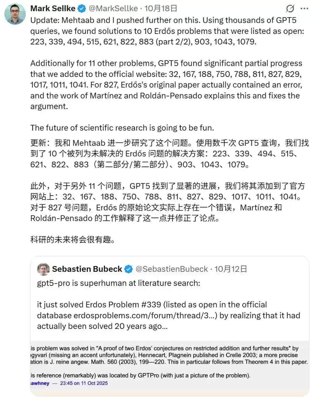 10月12日,Sebastien Bubeck发推表示,GPT-5在文献检索方面表现出色,发现埃尔德什问题339号已被解决,但最新的数据库中其状态尚未更新。