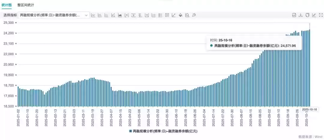 作为衡量股市活跃度的关键指标,两融余额近期也呈现快速增长。Wind数据显示,截至10月16日,全市场两融余额达2.457万亿元,较9月末的2.394万亿元增长2.63%,较6月末的1.850万亿元大幅增长32.81%。
