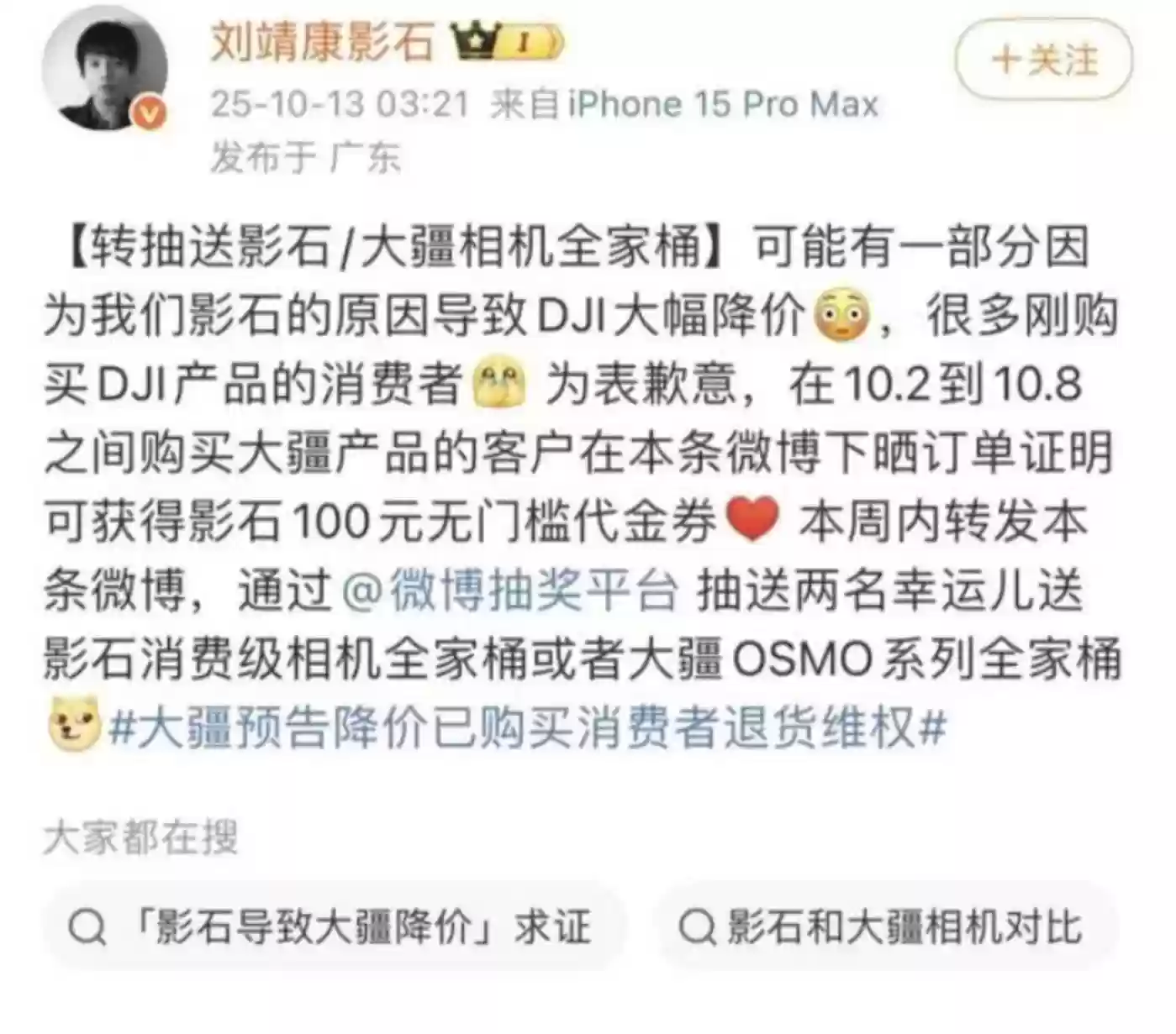 他发文表示:"可能有一部分因为我们影石的原因导致DJI大幅降价,为了向很多刚购买DJI产品的消费者表达歉意,在10月2日至10月8日期间购买大疆产品的客户,只需晒出订单证明即可获得影石100元无门槛代金券。"