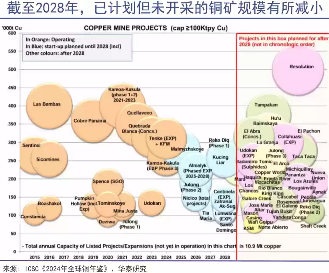 与此同时,新矿床的发现速度急剧下降。1990-2024年间发现的239个铜矿床中,仅有14个是在过去十年间发现的,且多是规模较小的矿床。ICSG《2024年全球铜年鉴》中指出,受制于矿石品位的持续下降,预计到2028年,新增铜矿产能的规模将会有所减小。