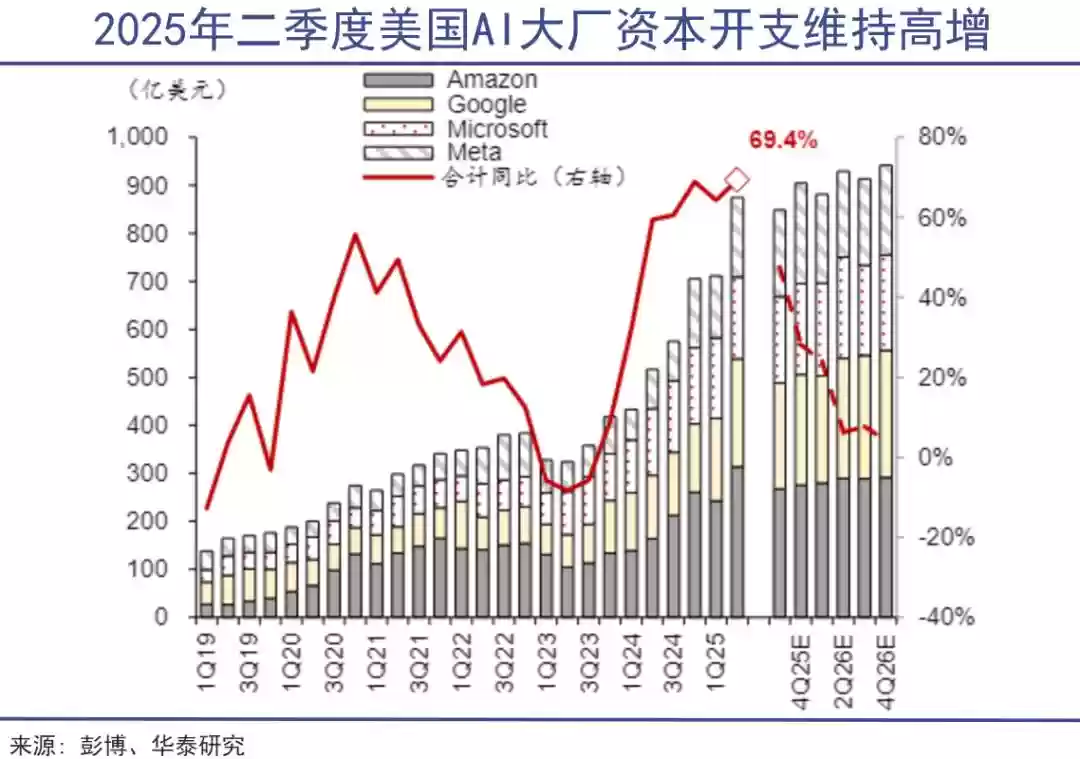 AI数据中心完全可以成为媲美房地产的新基建项目。美国四家AI大厂财报显示二季度其合计CAPEX规模已达874亿美元,预期全年资本支出将达到3400亿美元,占美国名义GDP的1%。