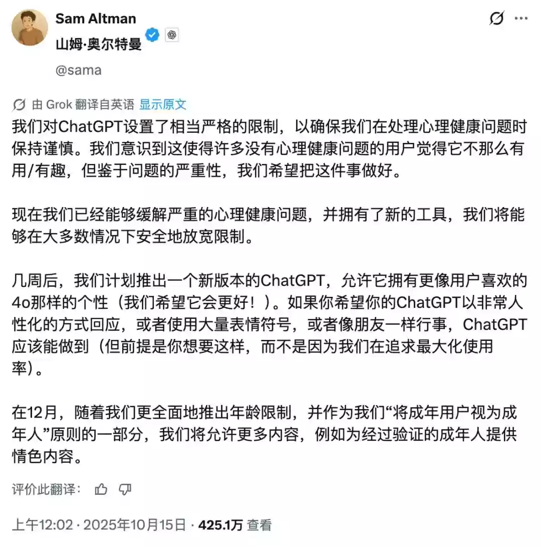 奥尔特曼并非没有注意到汹涌的民意。他透露几周后推出的新版ChatGPT,将恢复如4o般的个性化特质。根据用户需求,ChatGPT将能像真人一样对话、使用丰富的表情符号,甚至扮演朋友的角色。