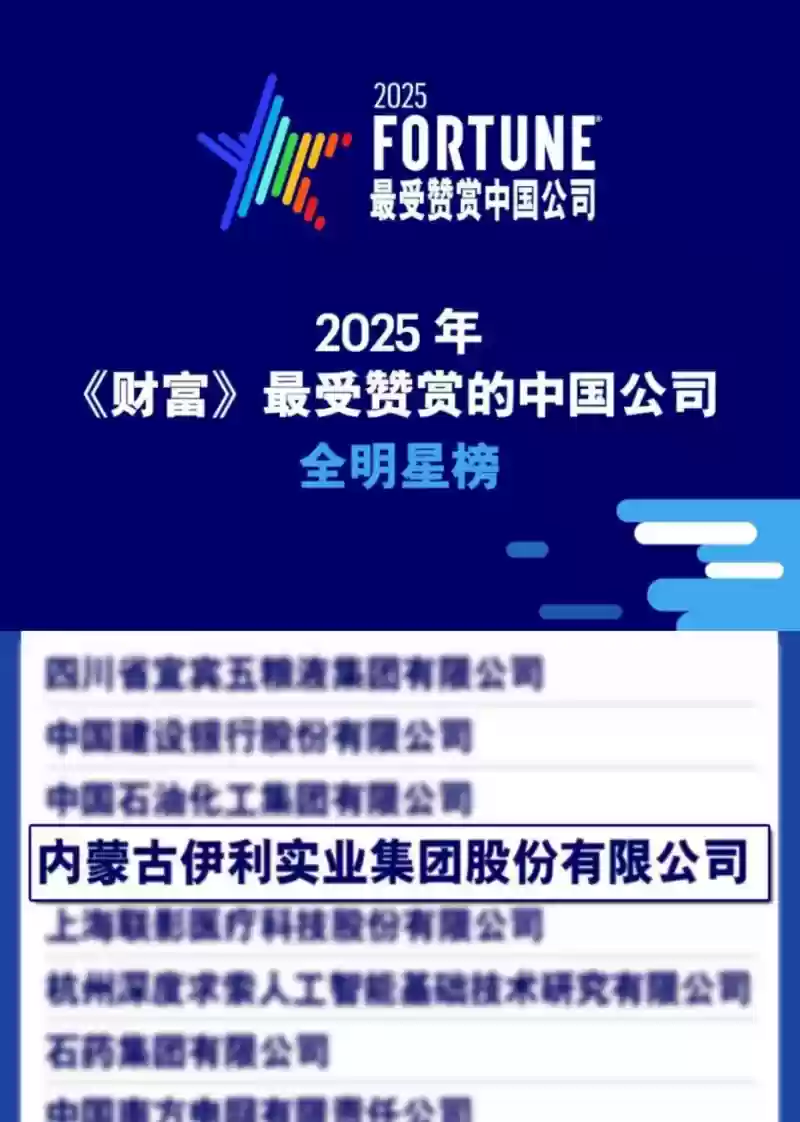 近日,《财富》杂志正式发布了2025年度"最受赞赏的中国公司"榜单。伊利集团凭借在社会责任等多方面的卓越表现,成功入选"全明星榜"与"行业明星榜"双榜。