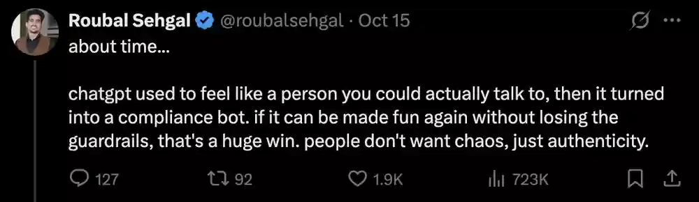10月15日,山姆·奥特曼在社交平台X上正式宣布,将于12月推出允许成年人访问的内容。