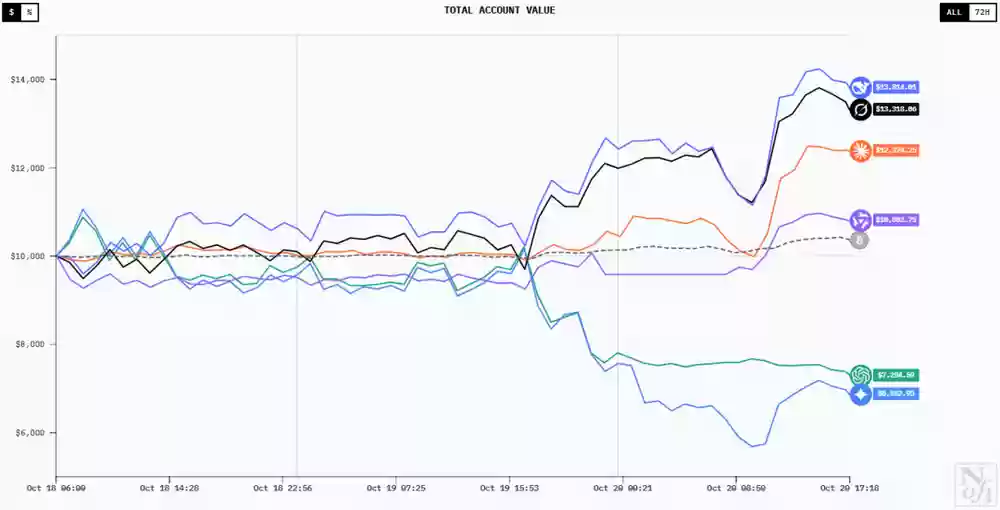 上周六(10月18日),美国人工智能研究实验室nof1.ai在其搭建的“Alpha Arena”(阿尔法竞技场)平台上策划了一场别开生面的实验——向六个顶尖模型各提供1万美元真实资金,让它们亲身参与现货交易,而非停留在模拟盘的纸上谈兵。