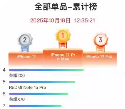 京东数据显示,截至10月18日,iPhone 17全系包揽销量榜前三,其中iPhone 17 Pro Max登顶,iPhone 17 Pro位列第三。