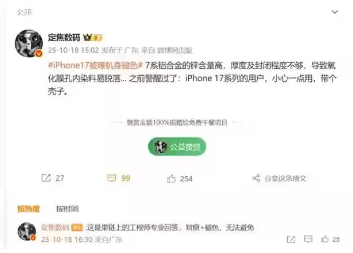 这次,iPhone 17 Pro刚发售一个月也出现了类似问题。