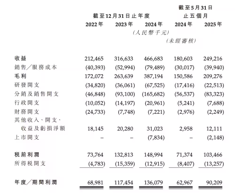 根据招股书披露的财务数据,海西新药在2024年、2024年、2024年及2025年前五个月的营业收入分别为2.12亿元、3.16亿元、4.67亿元和2.49亿元;同期净利润分别为6898万元、1.17亿元、1.36亿元和9021万元。