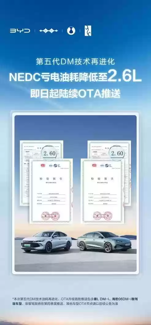 比亚迪第五代DM技术迎来重要升级,即日起将通过OTA方式为用户陆续推送更新。升级后,车辆在NEDC工况下的百公里亏电油耗进一步降低10%,达到令人惊喜的2.6升,再次刷新全球百公里亏电油耗的最低纪录,让用户体验更经济的用车成本。