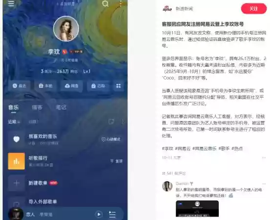 网易云音乐客服随后确认此事属实,回应称经核查,“问题原因为团队为艺人账号绑定的手机码被运营商二次放号所致,平台已第一时间联系新号主进行了相应处理”。