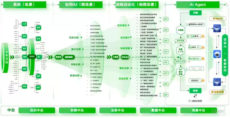 同样,全域数据平台实现的“语言统一与标准统一”,为AI应用提供了高质量数据底座。其次,最小业务节点的全面在线化与标准化,为实现流程自动化奠定了技术前提。最后,通过构建多Agent协同调度机制,将决策逻辑沉淀为可执行的知识网络,让AI真正成为业务决策的智能引擎。
