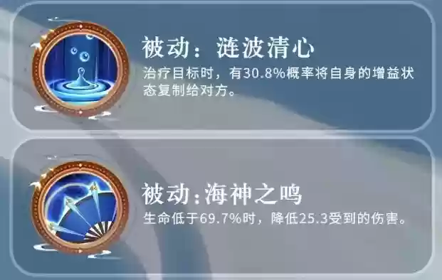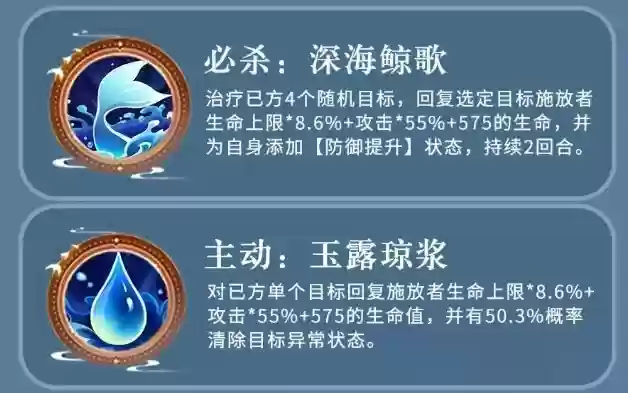 此外,治疗结束后,小乔还会为队友带来一定的防御提升,这个增益效果可持续两个回合。因此,小乔在自身具备一定生存保障的同时,还能为队友提供综合数值很高的生命恢复。若队伍需要提升生存能力,小乔的这个必杀技便显得尤为强大。她的主动技能“玉露琼浆”主要针对单一队友进行恢复,使用时带来的生命回复数值基于小乔生命上限的8.6%,加上攻击值的55%比例,再加上575点固定生命值。所以,这个主动技能的恢复数值与上述必杀技是一致的,区别在于一个是群体技能,一个是单体技能。不过,“玉露琼浆”相对于必杀技还额外具有约50%的几率清除队友身上的异常状态。小乔的另一项被动技能“连波清心”,可以在为队友治疗的同时触发额外效果;触发后,还有30%左右的概率将自身身上的增益状态复制到队友身上。此时若队友为输出角色,就能够带来更好的防御效果。