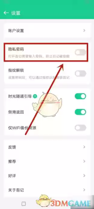 2、进入设置页面后,您会看到多个选项,请滑动找到并开启"隐私密码"这个功能开关。