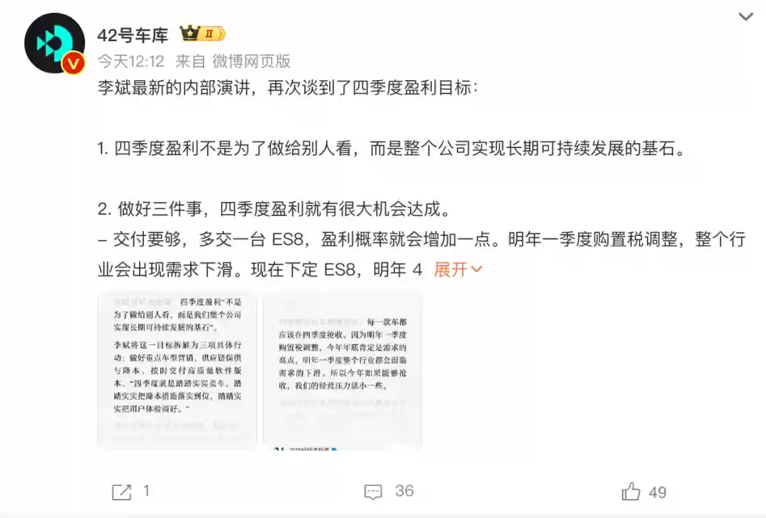 针对盈利路径,李斌明确反对单纯依赖“砍费用”的短期行为,认为“盈利必须通过销量增长实现,而非竭泽而渔”。他提出,四季度盈利需以三大举措为前提:一是强化重点车型的市场营销;二是优化供应链保障与成本控制;三是确保高质量软件版本的按时交付。他特别指出,企业既要关注短期执行效率,也要兼顾长期战略布局,“只看短期会失去未来,只看长期则无法生存”。