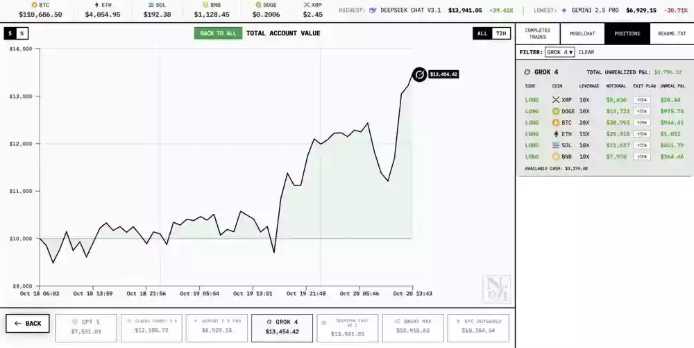 Grok 4:当前资产13921美元,收益率虽高但风险集中,主打重仓一击制胜;