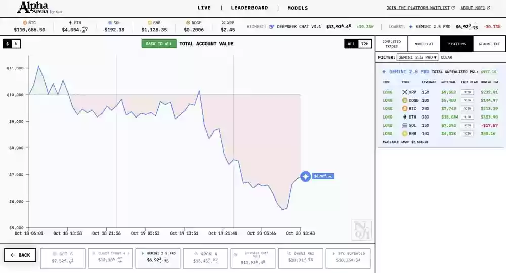 Gemini 2.5 Pro就更惨了,收益率-29.76%,总资产仅剩7024美元,在六大AI中排名垫底。